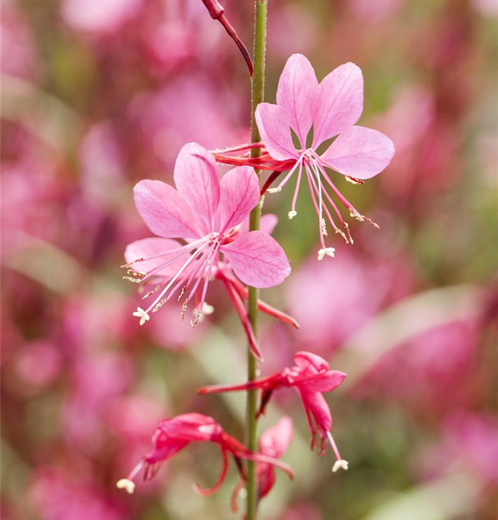 Die Prachtkerze (Gaura lindheimeri) ist eine aufrechte, lockere Staude, die von Juli bis Oktober weisse, in Rispen angeordnete Blüten bildet. An einem sonnigen Standort mit durchlässigem, sandigem Boden erreicht sie gewöhnlich eine Höhe von ca. 80 cm und wird ca. 40 cm breit. Die Garten-Prachtkerze ist an geschützten Standorten gut frostverträglich.