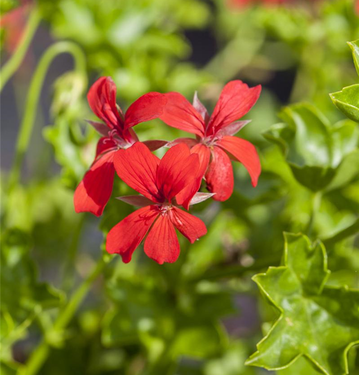 Pelargonium peltatum 'Ville de Paris Rot' bildet während der gesamten Saison zahlreiche rote Blüten.